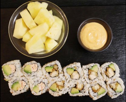 8 California Poulet Crispy Avocat – 4 California Saumon cuit Avocat – 1 coupe Ananas