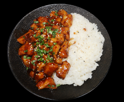 Porc au caramel, servi avec un bol de riz nature